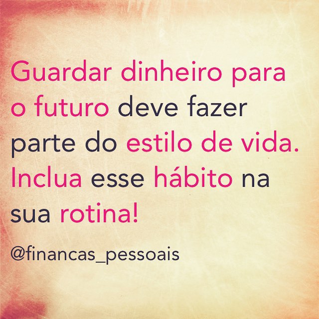 Crie o hábito de pagar a você mesmo em primeiro lugar, para ter dinheiro sempre! Assim você alcançará a liberdade de escolher o estilo de vida que você quer ter no futuro. E lembre-se de que quanto maior for o seu próprio esforço de poupança, mas dinheiro você terá no futuro para garantir a realização dos seus sonhos! Dinheiro parado na conta corrente nunca sobra, e nunca chega ao fim do mês. Pense nisso!