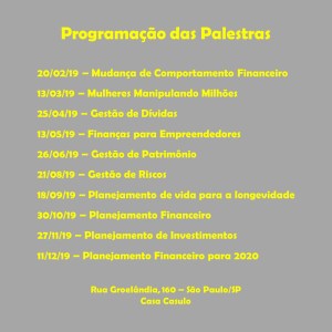 A programação foi pensada para abordar diversos assuntos super atuais de educação financeira pouco trabalhados com o público consumidor. O mercado financeiro fala muito para dentro de si mesmo, e pouco com o público!!! Vamos mudar essa realidade????