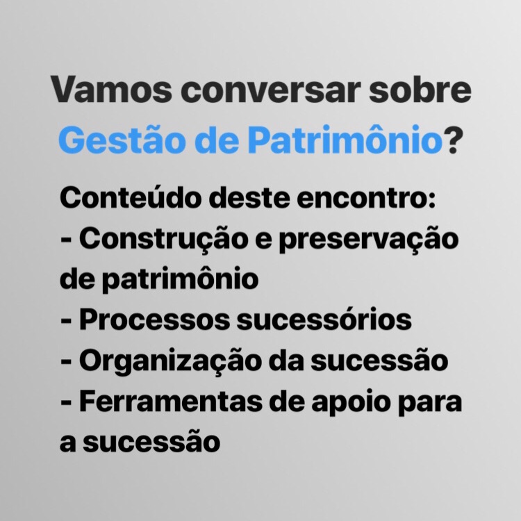 Vamos falar sobre como construir, administrar e preservar patrimônio ao longo do tempo e ao longo das gerações futuras da família, sobre como organizar o processo sucessório e ferramentas disponíveis para isso! Vamos?